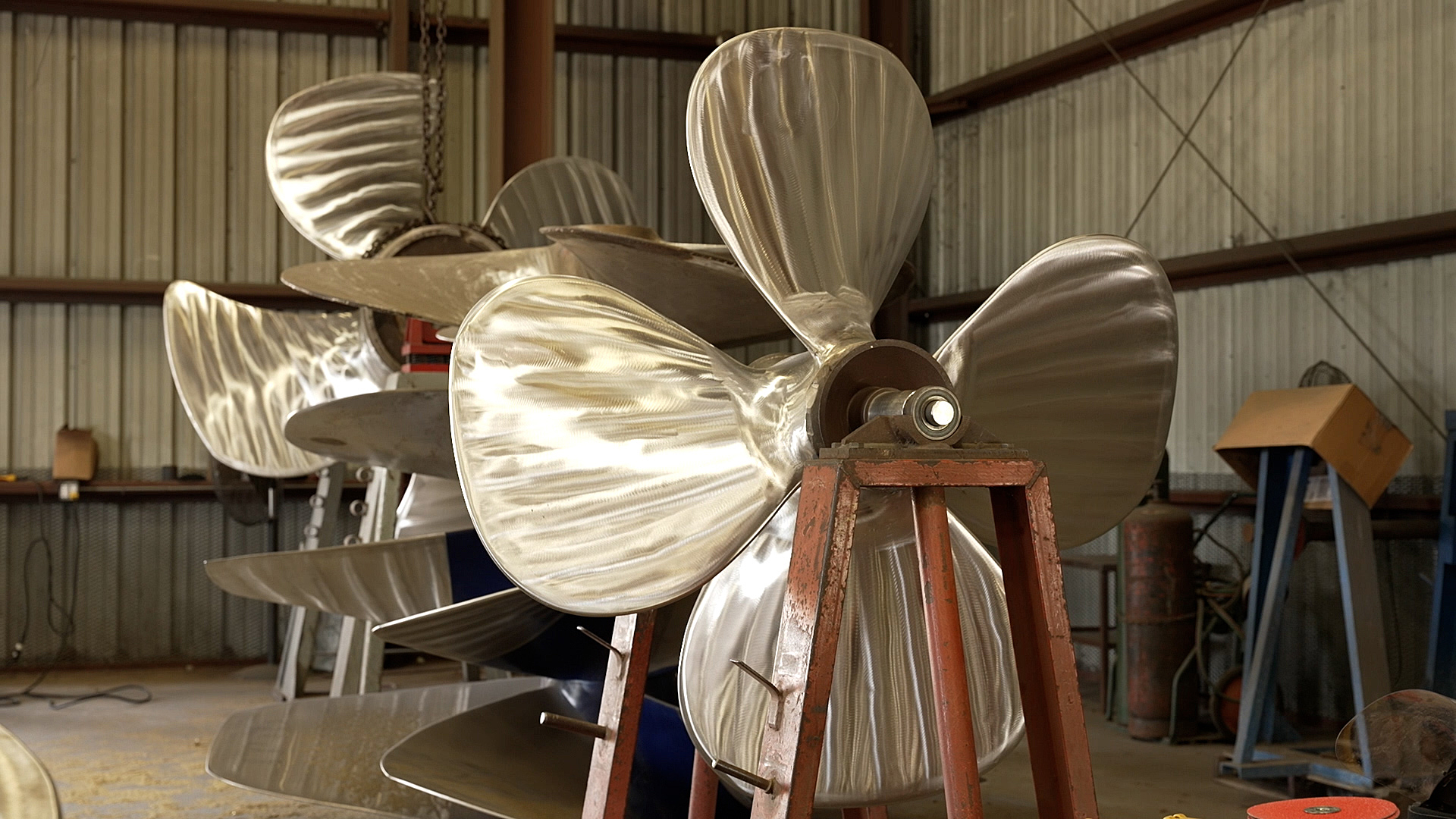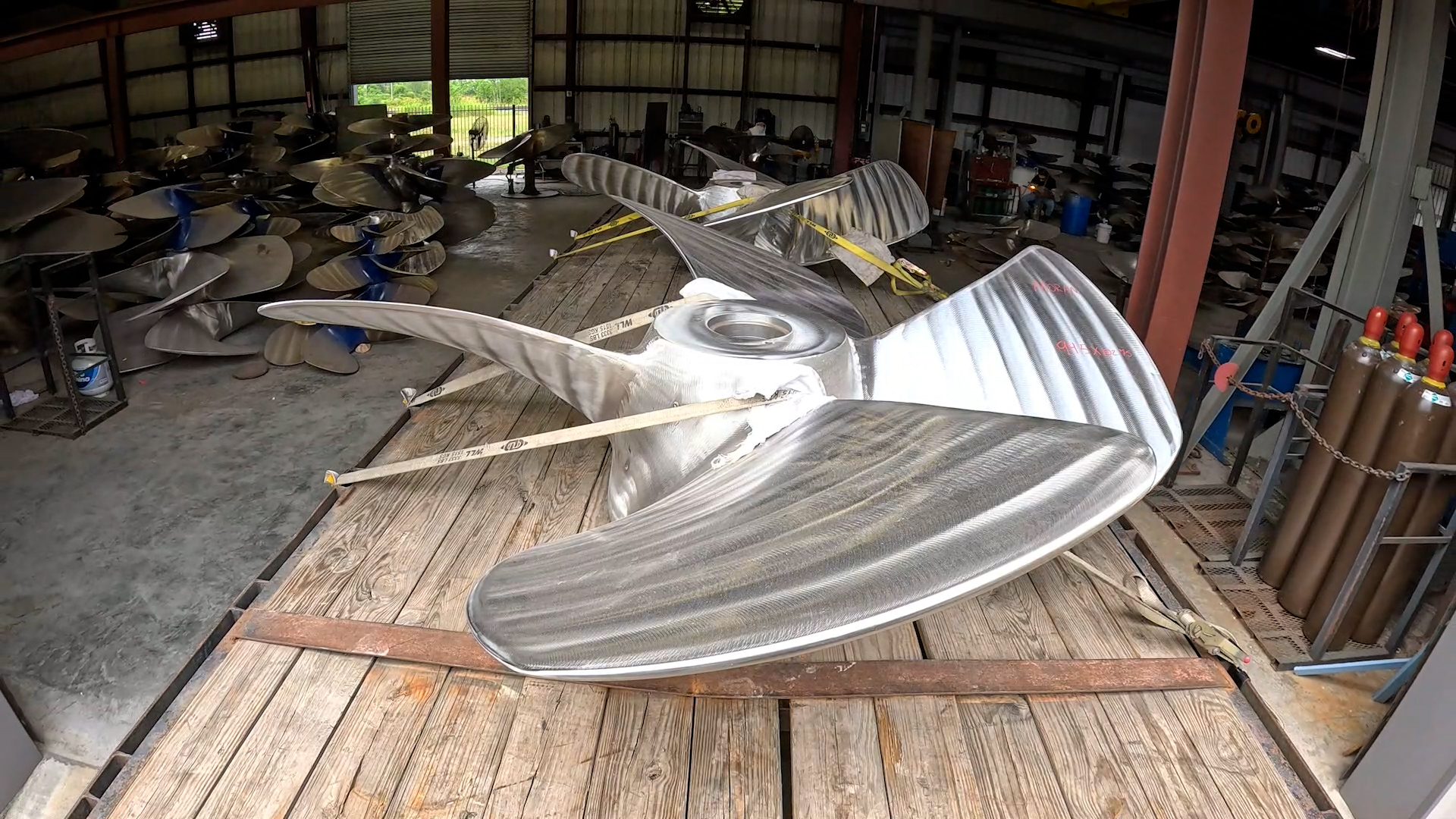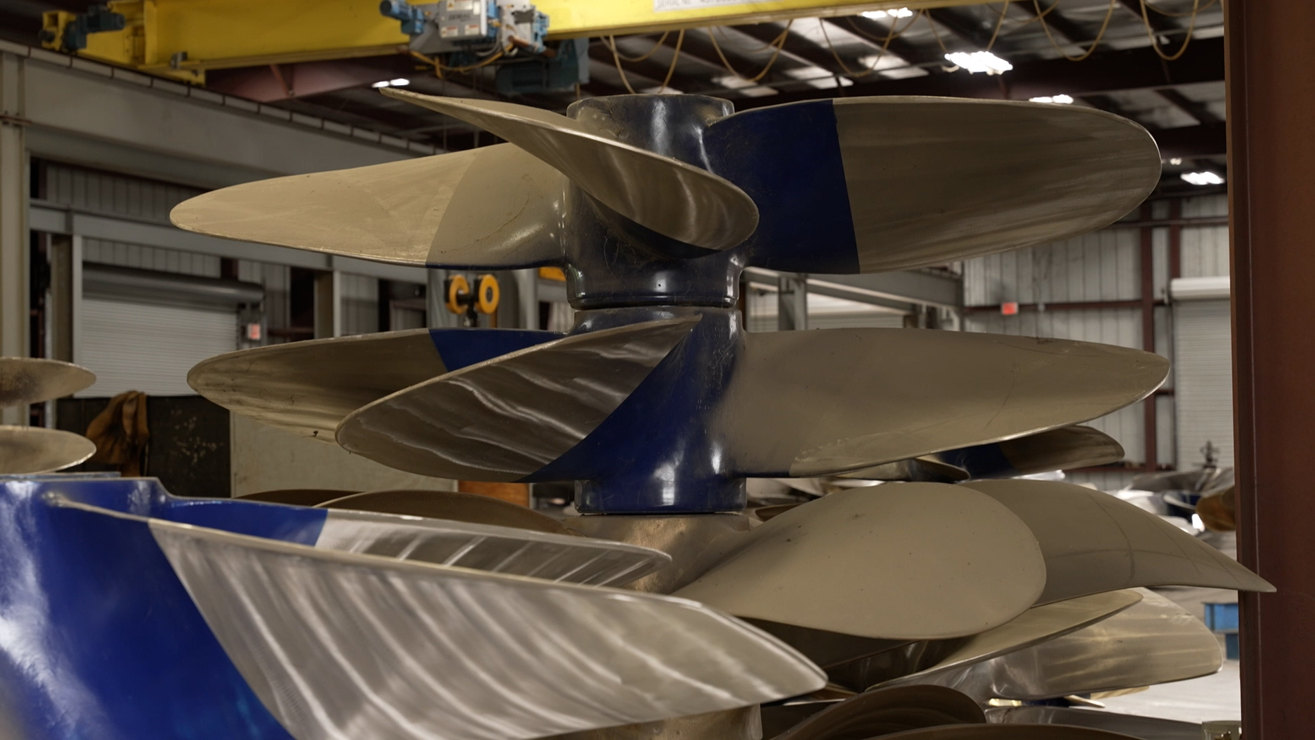 The propeller repair shop handles commercial propellers from 40” to 148” diameter, up to 5 tons.