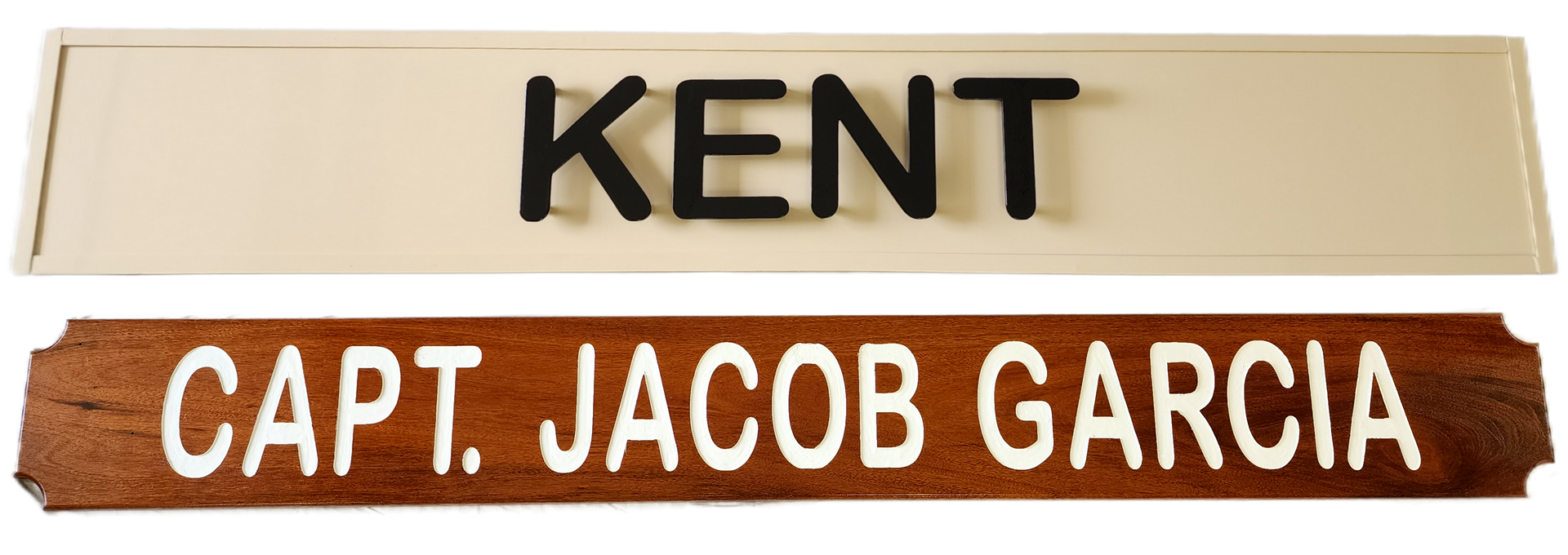 Customized mahogany name boards are displayed on the boat's port and starboard side for identification.